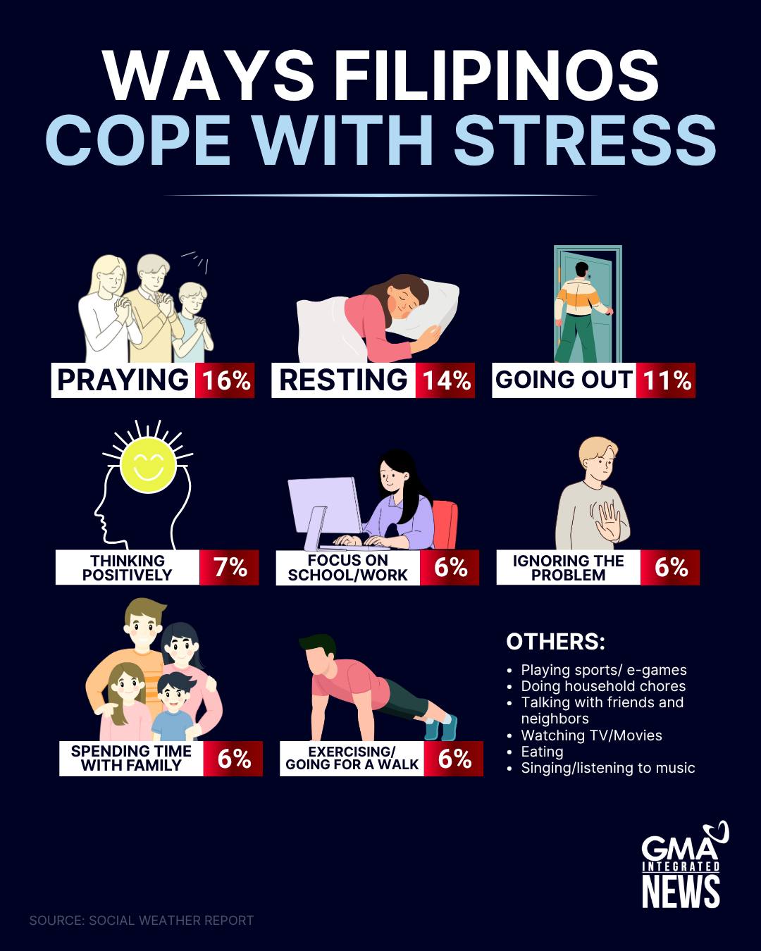 日本人にはピンときませんが、フィリピン人にとってストレスへの対処法で最も多いのは、祈ることだというニュースをご紹介します。2番目が休むこと、3番目が外に出かけることだそうです。FBのリンクはすぐに切れてしまうので、ランキングの画像を下にはっておきます。