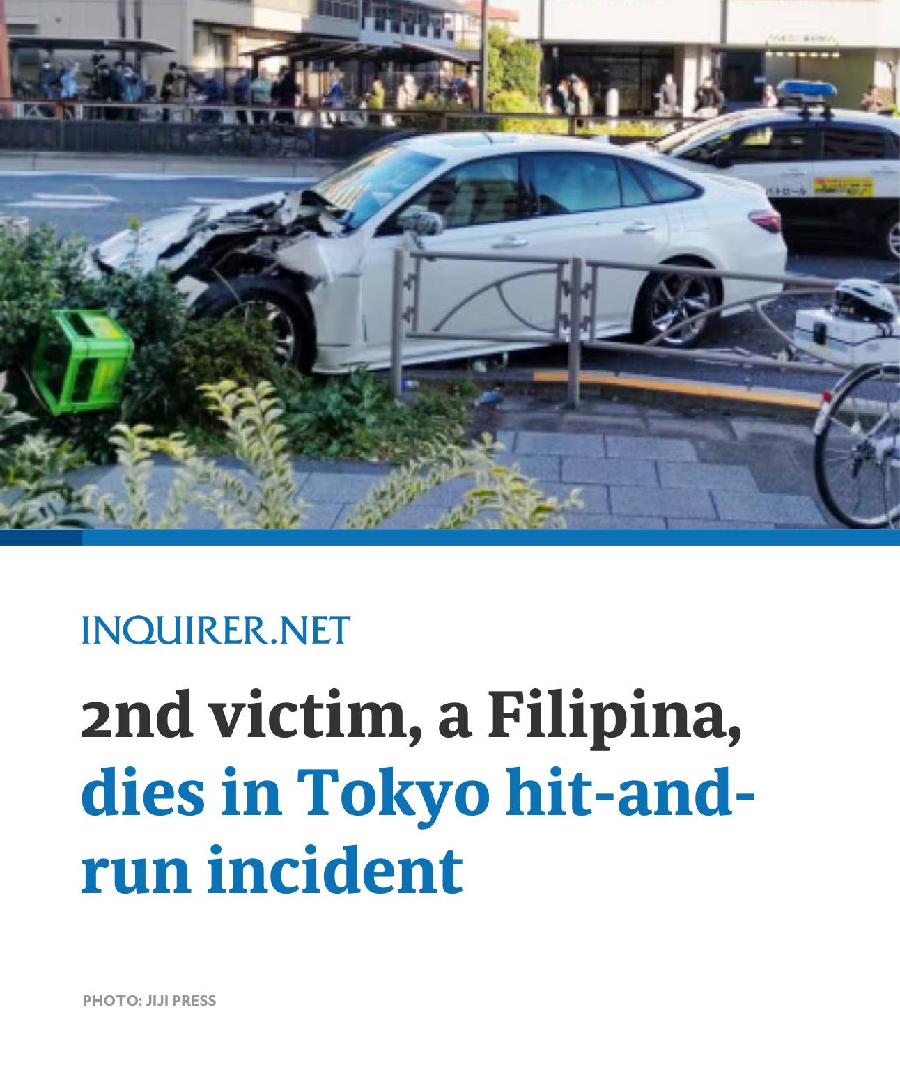 警視庁によると、フィリピン国籍の会社員グラディス・グレース・ロタキオ・テスタドさん(28)が月曜日の午後12時半頃、東京で道路を横断中に車にひかれ、病院で死亡した。