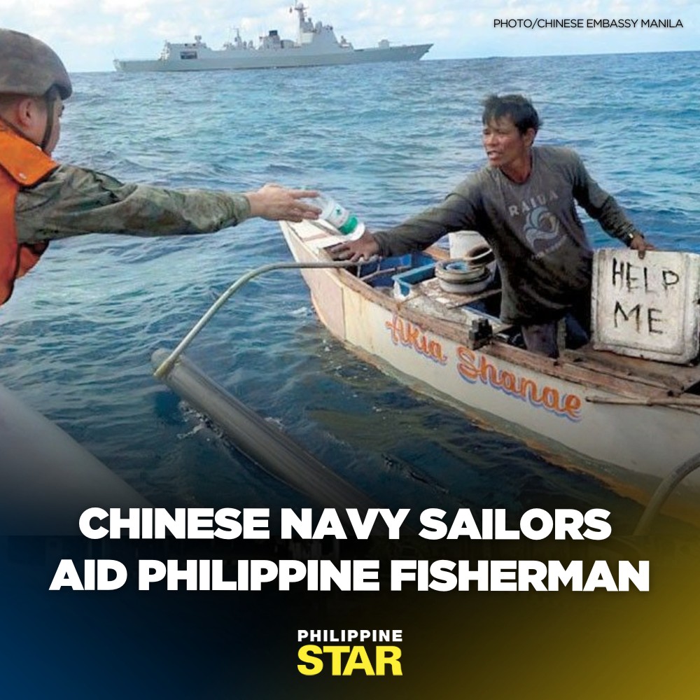 マニラ駐在の中国大使館は、中国軍兵士らが硬質ゴムボートに乗り、「助けて」と書かれた小型漁船に乗船した男性に、ボトル入りの水と食料を提供する様子を捉えた動画を公開した。