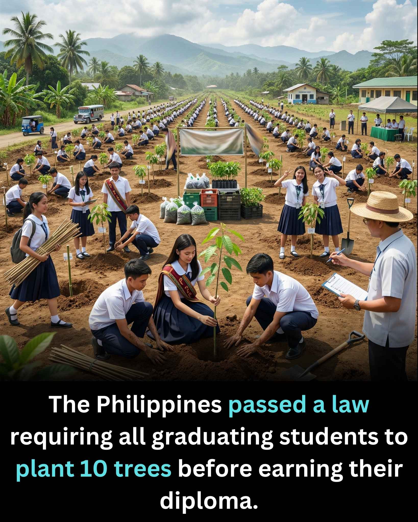 卒業証書を受け取る前に、すべての卒業生は10本の木を植えなければなりません。これは単なる義務ではありません。未来への生きた投資なのです。毎年何百万人もの学生が入学するこの法律によって、数千万本もの新しい木が植えられる可能性があります。それぞれの木は、森林破壊、気候変動、土壌浸食から静かに守ってくれるでしょう。