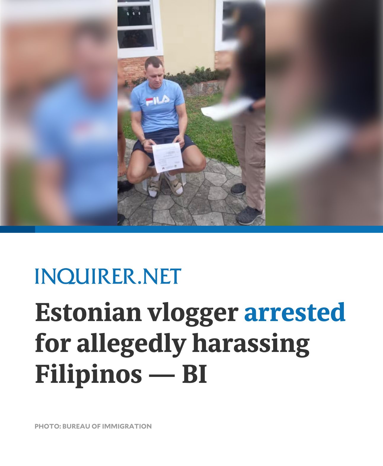 マニラ(フィリピン)発 ― エストニア人ブロガーが、フィリピン人への嫌がらせ、および許可のない撮影と侮辱的な行為の苦情を受けて逮捕されたと、フィリピン移民局(BI)が土曜日に発表した。
