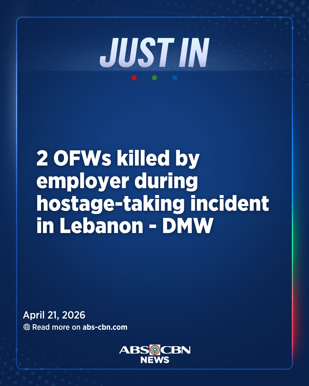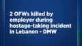 マニラ発 ― フィリピン人海外労働者2名が先週、レバノンのベイルートで発生した人質事件で雇用主によって殺害されたと、フィリピン海外労働者省(DMW)が火曜日に確認した。