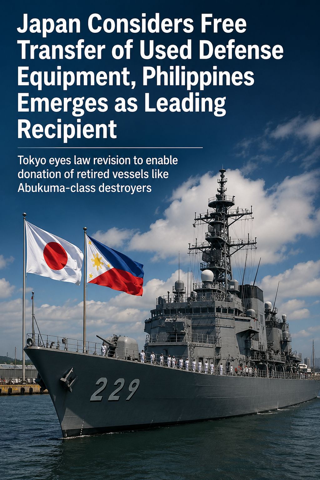 日本は、自衛隊の中古装備(殺傷能力を持つ装備も含む可能性あり)を主要パートナー国に低コストまたは無償で移転することを可能にする、大きな政策転換を検討している。この提案は、海洋における緊張の高まりを受け、地域安全保障協力の強化を目指す東京の広範な取り組みの一環である。移転対象として検討されているのは、退役予定の阿武隈型護衛艦などであり、海軍の近代化を進めるフィリピンが有力な移転先候補として浮上している。高官レベルの協議と法改正は、年内に進展する見込みだ。